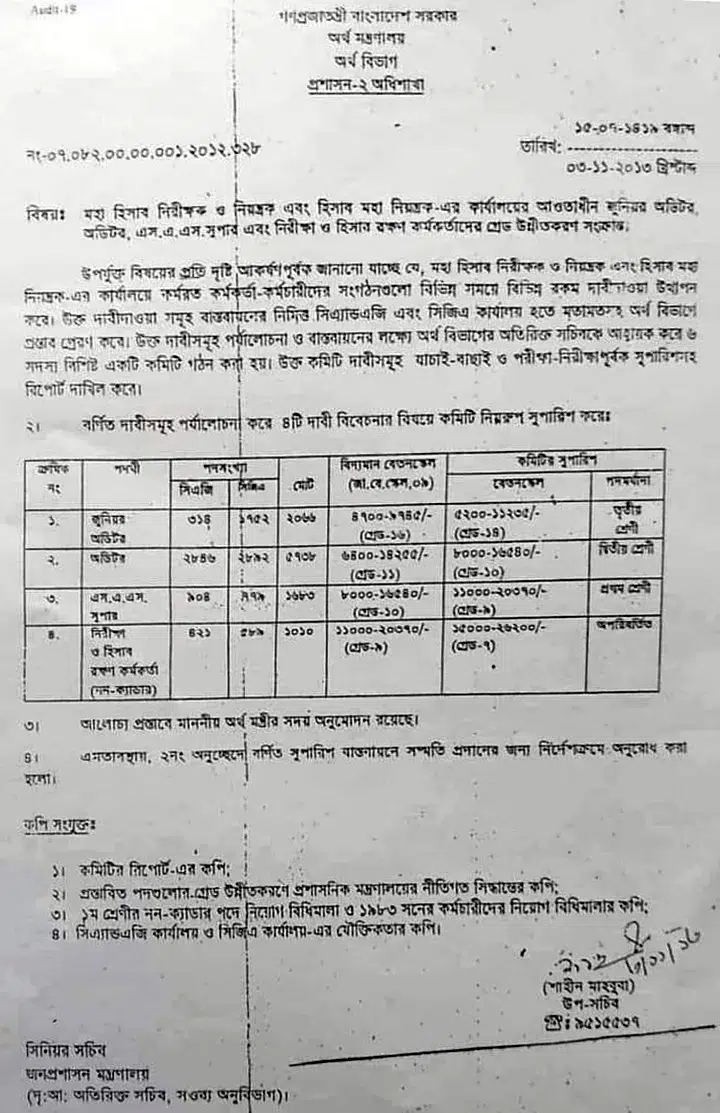 অডিটরগণ আদালতে রীট করে ১১তম গ্রেড হতে কেন তাদের দশম গ্রেডে উন্নীত হয়। অডিটর পদটিকে দশম গ্রেডে উন্নীত হলেও সরকারি আদেশ জারি করতে হবে সরকার গড়ীমশি করে।