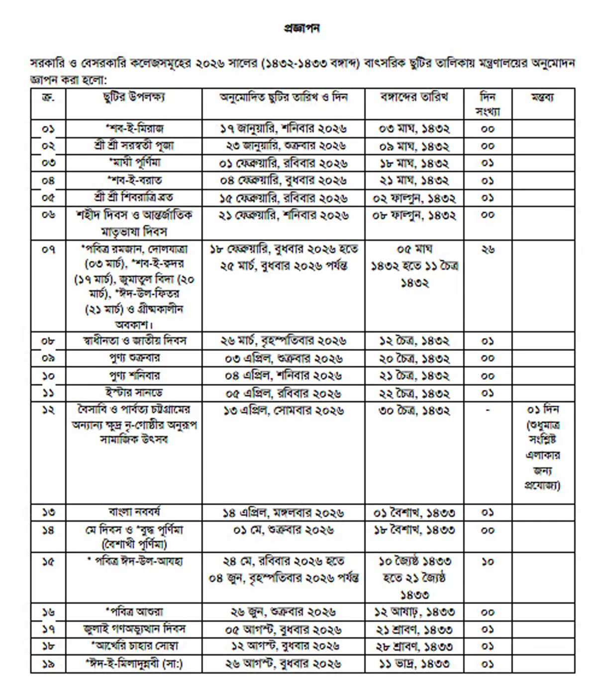শিক্ষা মন্ত্রণালয়ের মাধ্যমিক ও উচ্চশিক্ষা বিভাগ প্রকাশিত তালিকায় দেখা গেছে, পবিত্র রমজান, ঈদুল ফিতর-গ্রীষ্মকালীন ছুটি মিলে ১৮ ফেব্রুয়ারি থেকে ২৫ মার্চ পর্যন্ত টানা ২৬ দিন বন্ধ থাকবে কলেজগুলো। স্বাধীনতা ও জাতীয় দিবসে (২৬ মার্চ) এক দিনের ছুটি রয়েছে। এর পরের দুই দিন শুক্র ও শনিবার সাপ্তাহিক ছুটি। সে হিসাবে ২৯ মার্চ, রোববার থেকে খুলবে কলেজগুলো।