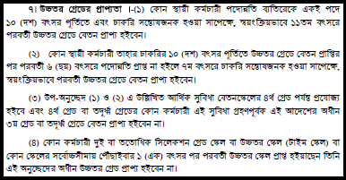 জাতীয় বেতন স্কেল ২০১৫ অনুচ্ছেদর ৭ এর উপানুচ্ছেদ ১ ও ২- সন্তোষজনক চাকরি এবং স্বয়ংক্রিয়ভাবে উচ্চতর গ্রেড প্রাপ্তি সন্তোষজনক চাকরির ব্যাখ্যা হচ্ছে সন্তোষজনক চাকরি বুঝাইতে কর্মচারিদের পদোন্নতিসহ প্রযোজ্য ক্ষেত্রে যেইভাবে সন্তোষজনক চাকরি বিদ্যমান বিধিবিধান অনুসৃত হইয়া থাকে বিবেচ্য উচ্চতর গ্রেডে বেতন প্রাপ্তির ক্ষেত্রেও অনুরূপ বিধি বিধানসহ প্রযোজ্য হইবে।