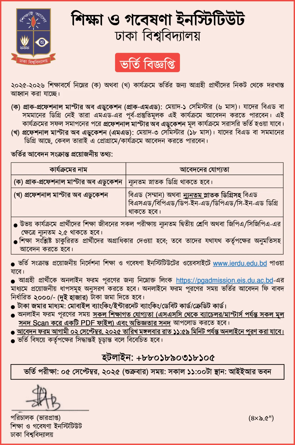 ঢাকা বিশ্ববিদ্যালয়ে(ঢাবি) শিক্ষা ও গবেষণা ইনস্টিটিউটে ২০২৫-২৬ শিক্ষাবর্ষে প্রাক-প্রফেশনাল মাস্টার অব এডুকেশন ও প্রফেশনাল মাস্টার অব এডুকেশনে ভর্তি বিজ্ঞপ্তি প্রকাশিত হয়েছে।